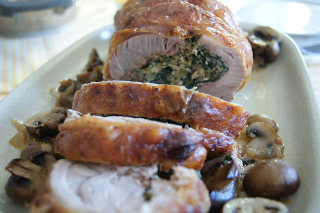 Entretanto tire a pele a uma alheira e leve-a numa certã ao lume para desfazer e fritar um pouco. Junte de seguida um pacote inteiro de folhas de espinafres e vá mexendo até as folhas perderem toda água e se misturarem com a pasta da alheira. Tempere a gosto, espalhe esta pasta pela coxa de peru e enrole de maneira a que o recheio fique bem acondicionado. Ate a carne com fio de cozinha, ponha o rolo num tabuleiro, espalhe pedacinhos de manteiga em cima e leve ao forno a assar a 180º.