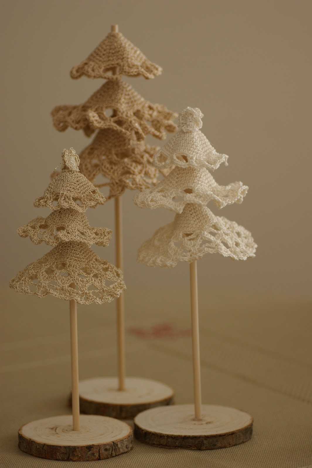 Estas delicadas árvores de crochet foram este ano centro da mesa da ceia de Natal.